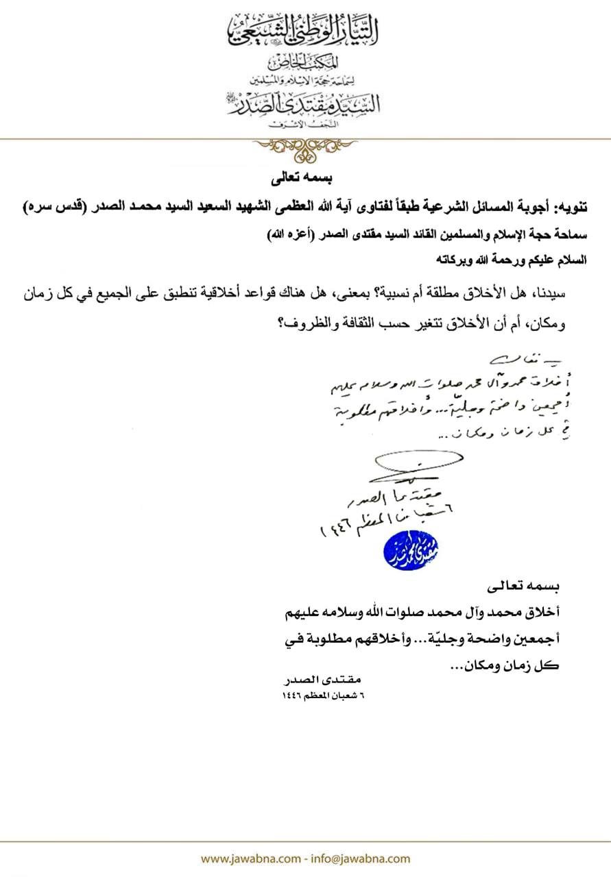 سماحة القائد السيد مقتدى الصدر (أعزه الله) يجيب على سؤال قدم لسماحته حول الأخلاق مطلقة أم نسبية 04/05/2025 15:12:00 عدد القراءات : 142 المكتب الخاص/ النجف الأشرف