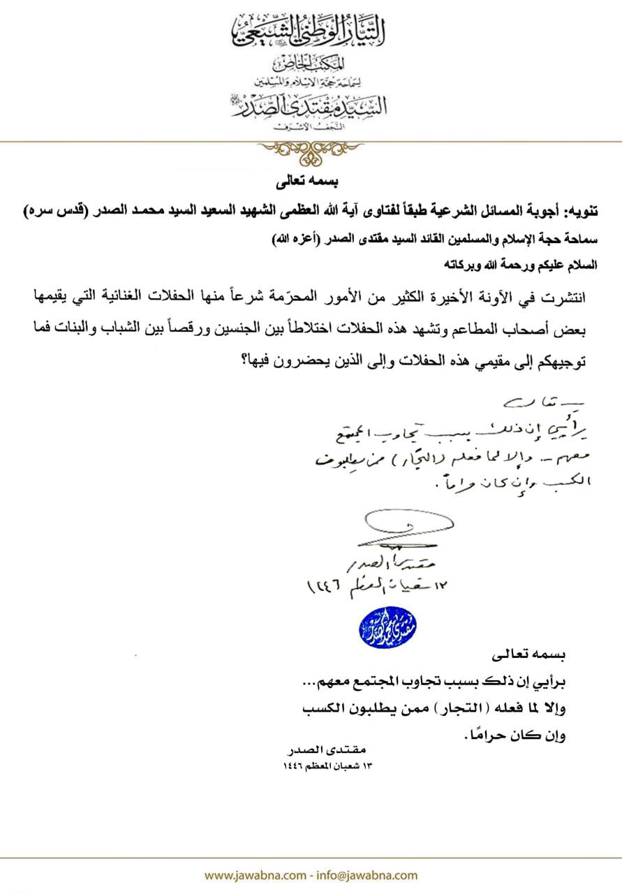 سماحة القائد السيد مقتدى الصدر (أعزه الله) يجيب على سؤال قدم لسماحته حول الحفلات الغنائية التي يقيمها بعض أصحاب المطاعم