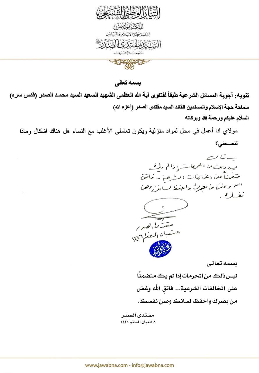 سماحة القائد السيد مقتدى الصدر (أعزه الله) يجيب على سؤال قدم لسماحته حول شخص يعمل في محل وتعامله الأغلب مع النساء 04/05/2025 15:32:00 عدد القراءات : 229 المكتب الخاص/ النجف الأشرف