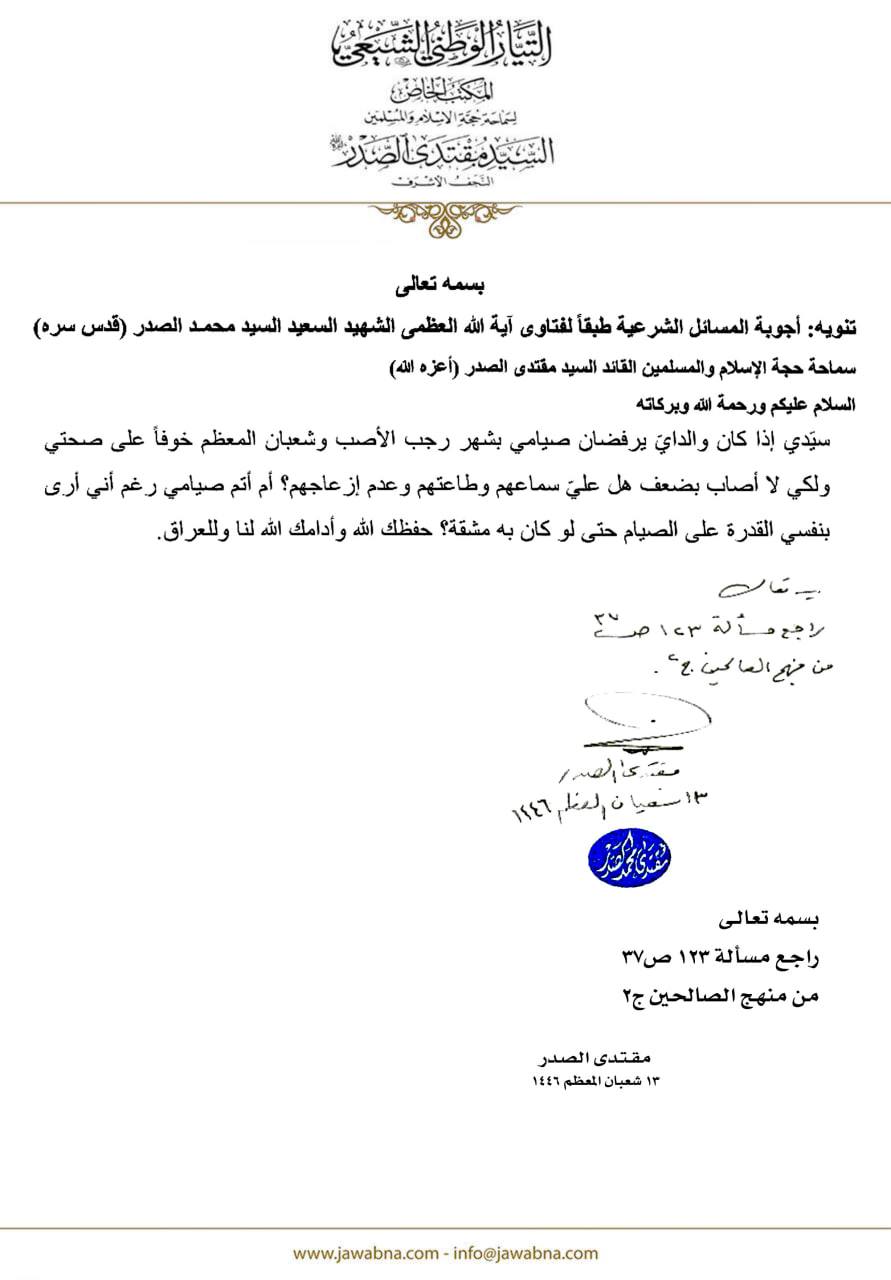 سماحة القائد السيد مقتدى الصدر (أعزه الله) يجيب على سؤال قدم لسماحته حول من صام شهر رجب وشعبان ووالداه يمنعانه خوفا على صحته
