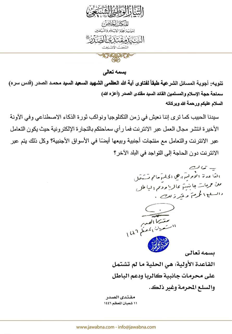 سماحة القائد السيد مقتدى الصدر (أعزه الله) يجيب على سؤال قدم لسماحته حول التجارة الالكترونية 05/05/2025 14:36:00 عدد القراءات : 268 المكتب الخاص/ النجف الأشرف