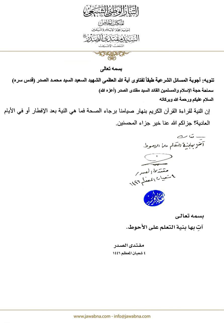 سماحة القائد السيد مقتدى الصدر (أعزه الله) يجيب على سؤال قدم لسماحته حول النية لقراءة القرآن الكريم بعد الافطار 05/05/2025 15:03:00 عدد القراءات : 108 المكتب الخاص/ النجف الأشرف
