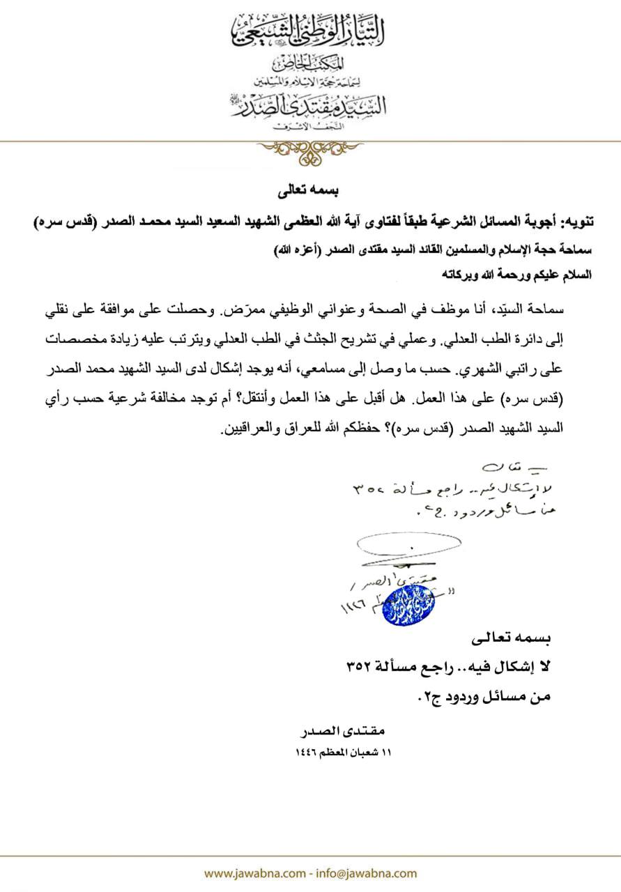 سماحة القائد السيد مقتدى الصدر (أعزه الله) يجيب على سؤال قدم لسماحته من ممرض يعمل في تشريح الجثث في الطب العدلي 05/05/2025 15:09:00 عدد القراءات : 215 المكتب الخاص/ النجف الأشرف