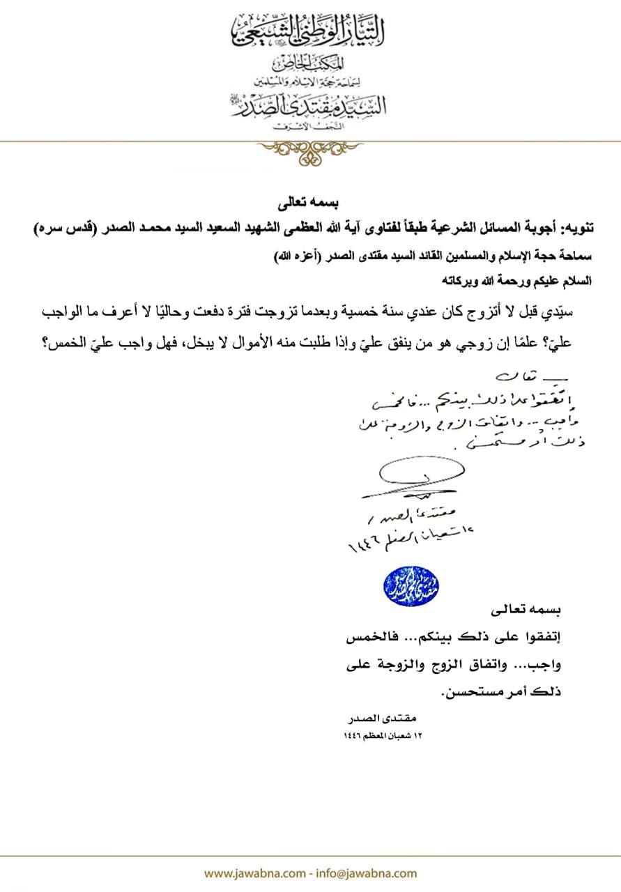 سماحة القائد السيد مقتدى الصدر (أعزه الله) يجيب على سؤال قدم لسماحته حول امرأة متزوجة زوجها ينفق عليها فهل واجب عليها الخمس