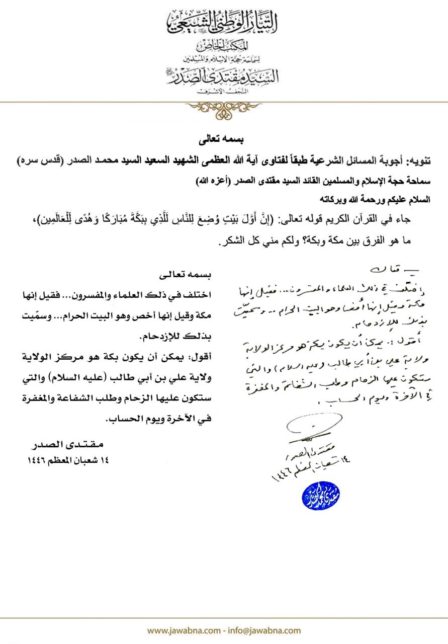 سماحة القائد السيد مقتدى الصدر (أعزه الله) يجيب على سؤال قدم لسماحته حول قوله تعالى (إِنَّ أَوَّلَ بَيْتٍ وُضِعَ لِلنَّاسِ لَلَّذِي بِبَكَّةَ مُبَارَكًا وَهُدًى لِلْعَالَمِينَ)