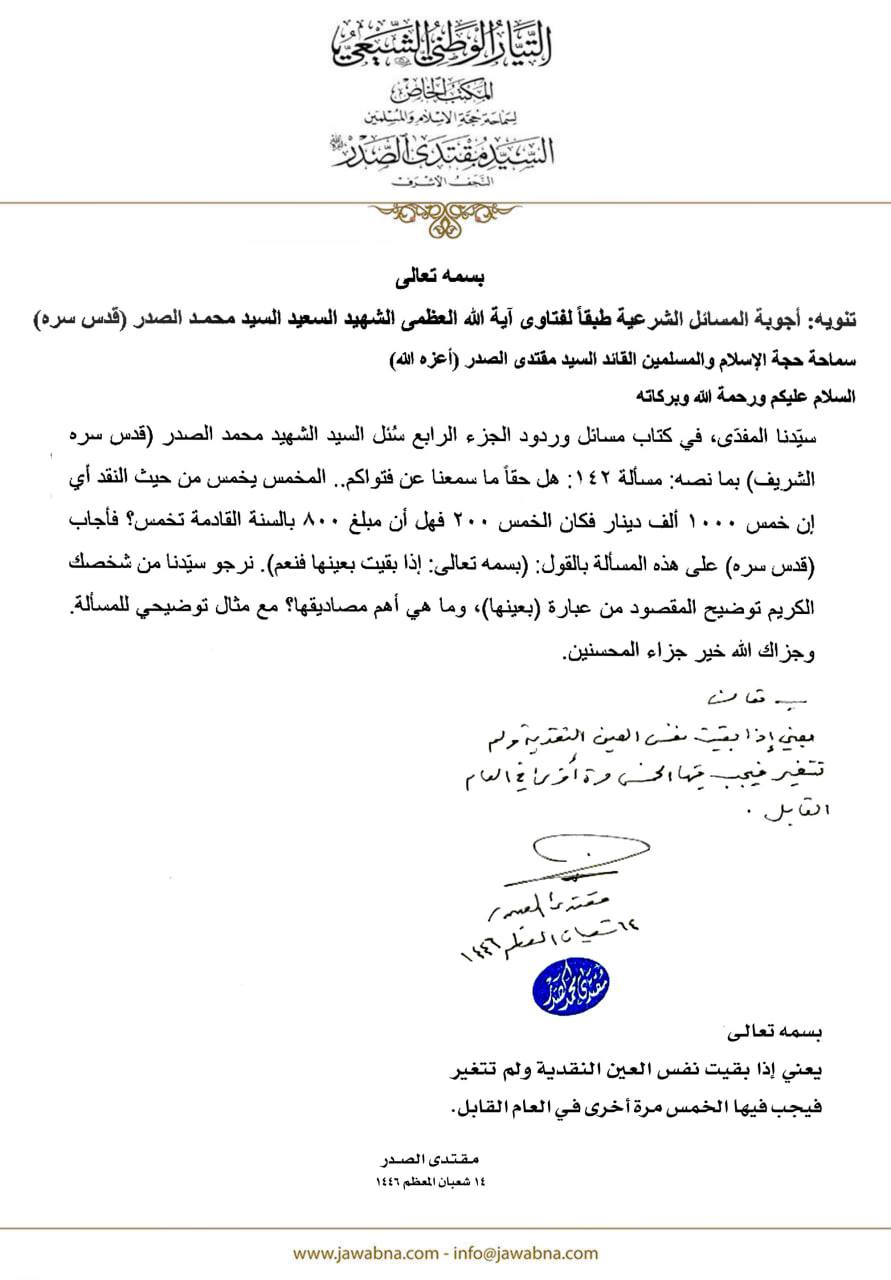 سماحة القائد السيد مقتدى الصدر (أعزه الله) يجيب على سؤال قدم لسماحته حول الخمس وتوضيح المقصود (اذا بقيت بعينها فنعم ) 10/05/2025 14:59:00 عدد القراءات : 110 المكتب الخاص / النجف الأشرف