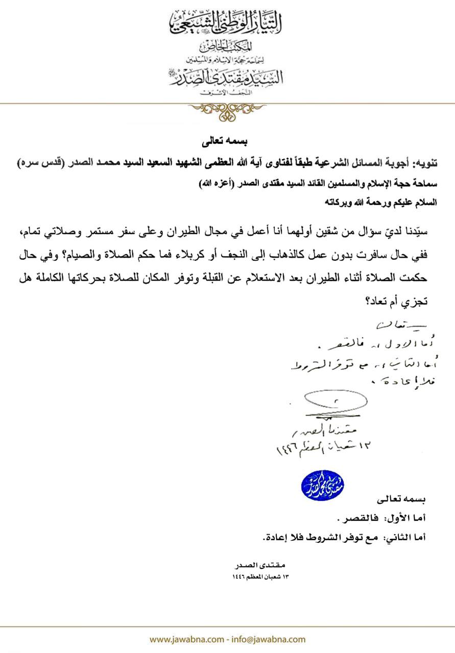 سماحة القائد السيد مقتدى الصدر (أعزه الله) يجيب على سؤال قدم لسماحته حول حكم الصلاة اثناء الطيران 10/05/2025 15:02:00 عدد القراءات : 75 المكتب الخاص / النجف الأشرف