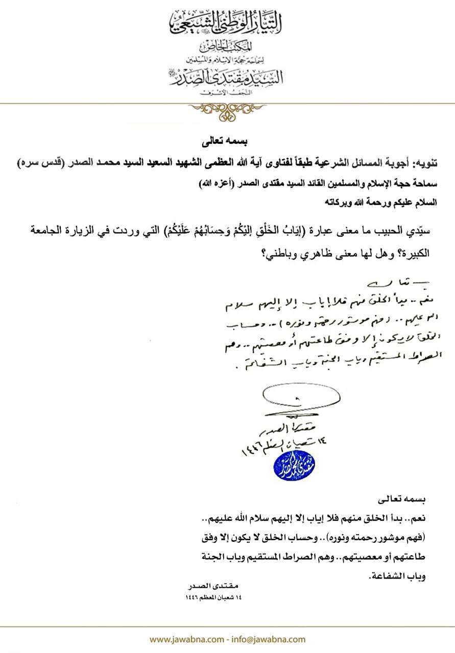 سماحة القائد السيد مقتدى الصدر (أعزه الله) يجيب على سؤال قدم لسماحته حول معنى عبارة (إياب الخلق اليكم وحسابهم عليكم) 10/05/2025 15:04:00 عدد القراءات : 80 المكتب الخاص / النجف الأشرف