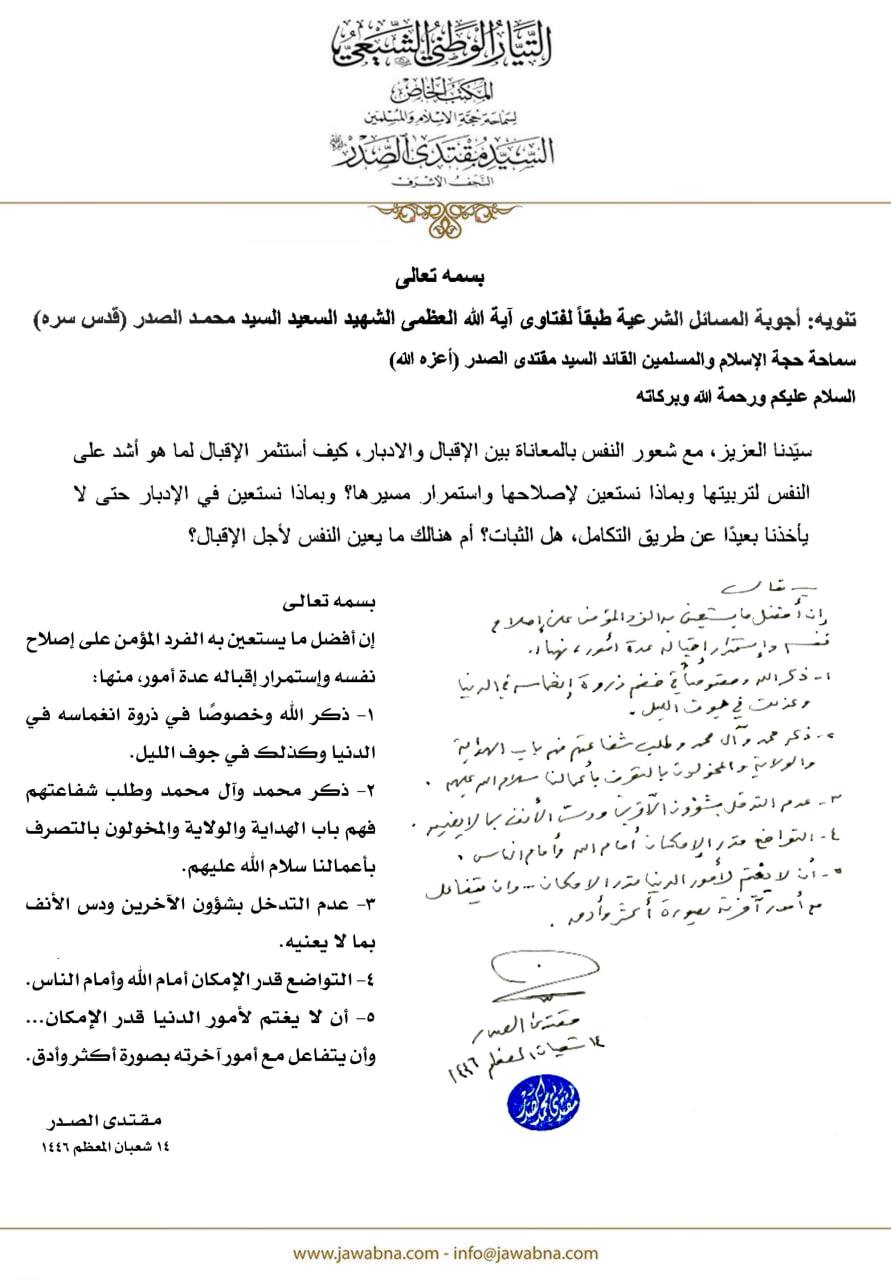 سماحة القائد السيد مقتدى الصدر (أعزه الله) يجيب على سؤال قدم لسماحته حول اقبال وادبار النفس 10/05/2025 15:15:00 عدد القراءات : 104 المكتب الخاص / النجف الأشرف