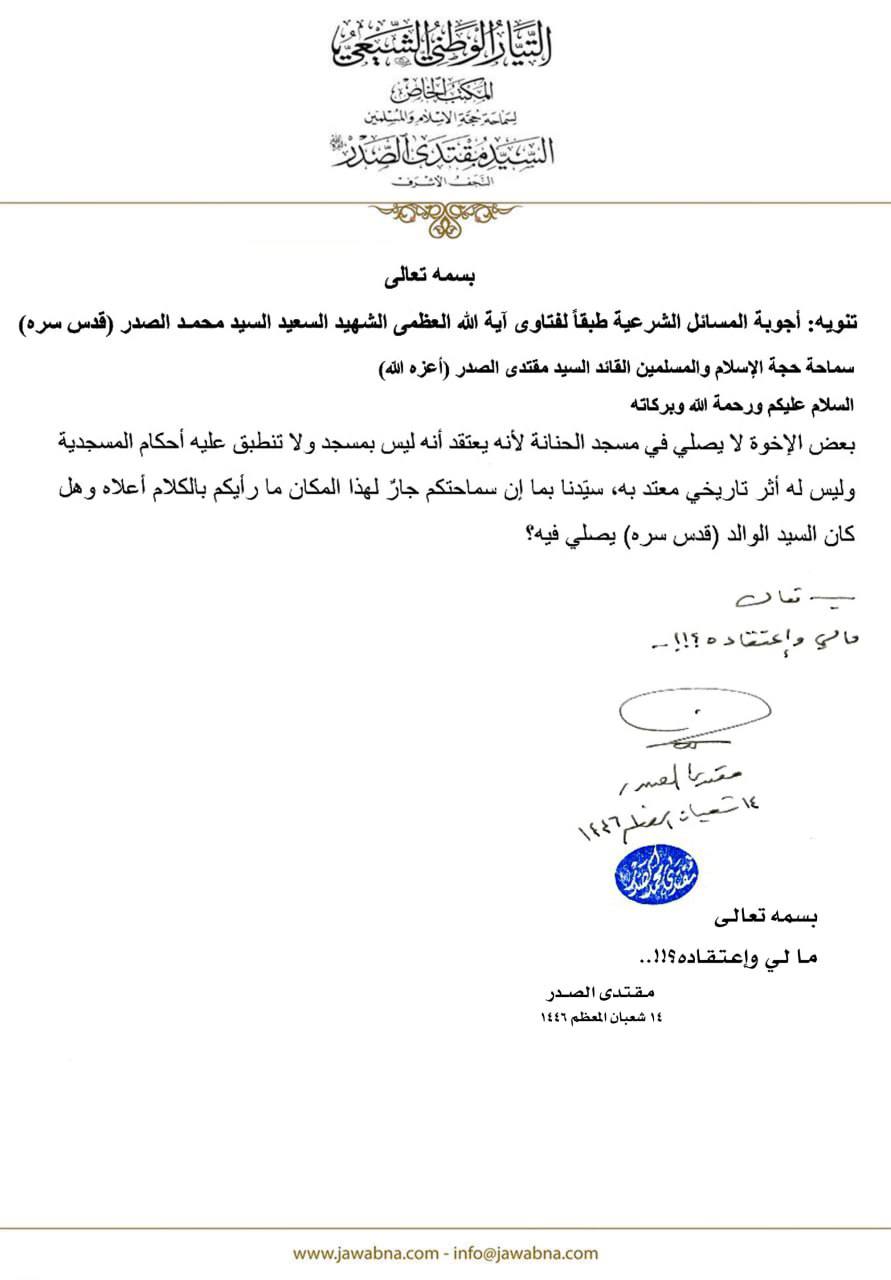 سماحة القائد السيد مقتدى الصدر (أعزه الله) يجيب على سؤال قدم لسماحته حول الصلاة في مسجد الحنانة 10/05/2025 15:21:00 عدد القراءات : 103 المكتب الخاص / النجف الأشرف