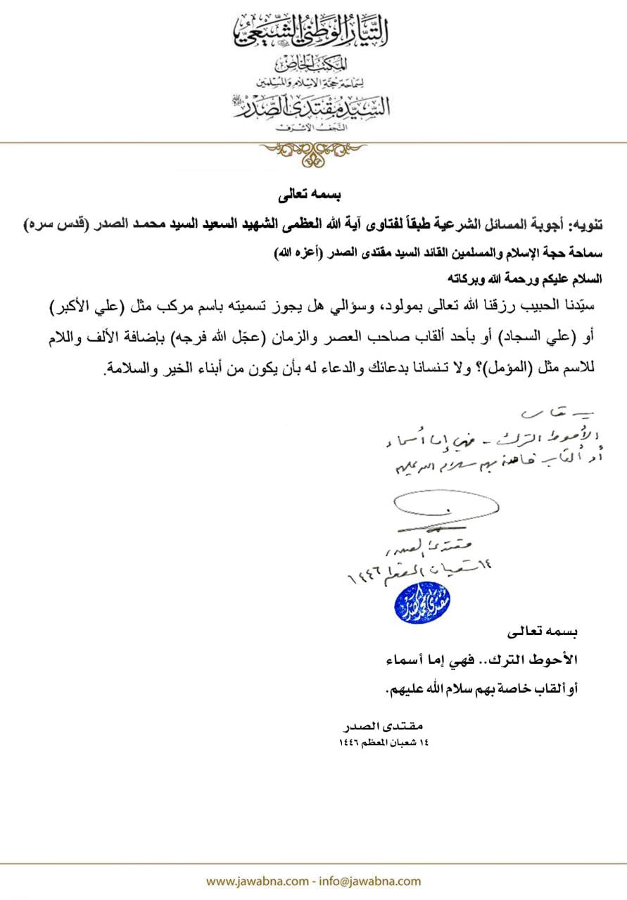سماحة القائد السيد مقتدى الصدر (أعزه الله) يجيب على سؤال قدم لسماحته حول تسميت المولود الجديد باسم مركب مثل (علي الأكبر) أو (علي السجاد) أو أحد القاب صاحب الزمان العصر والزمان (عجل الله فرجه)