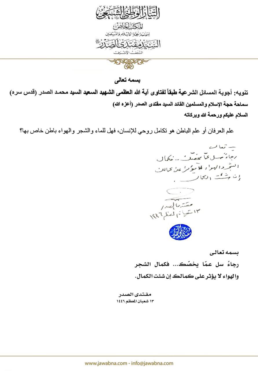سماحة القائد السيد مقتدى الصدر (أعزه الله) يجيب على سؤال قدم لسماحته حول هل للماء والشجر والهواء باطن خاص 10/05/2025 15:15:00 عدد القراءات : 81