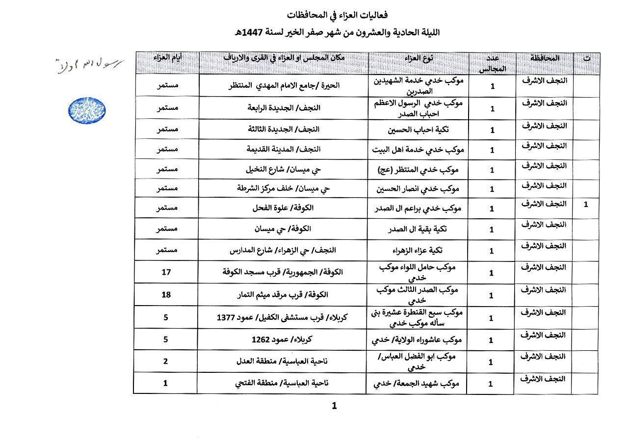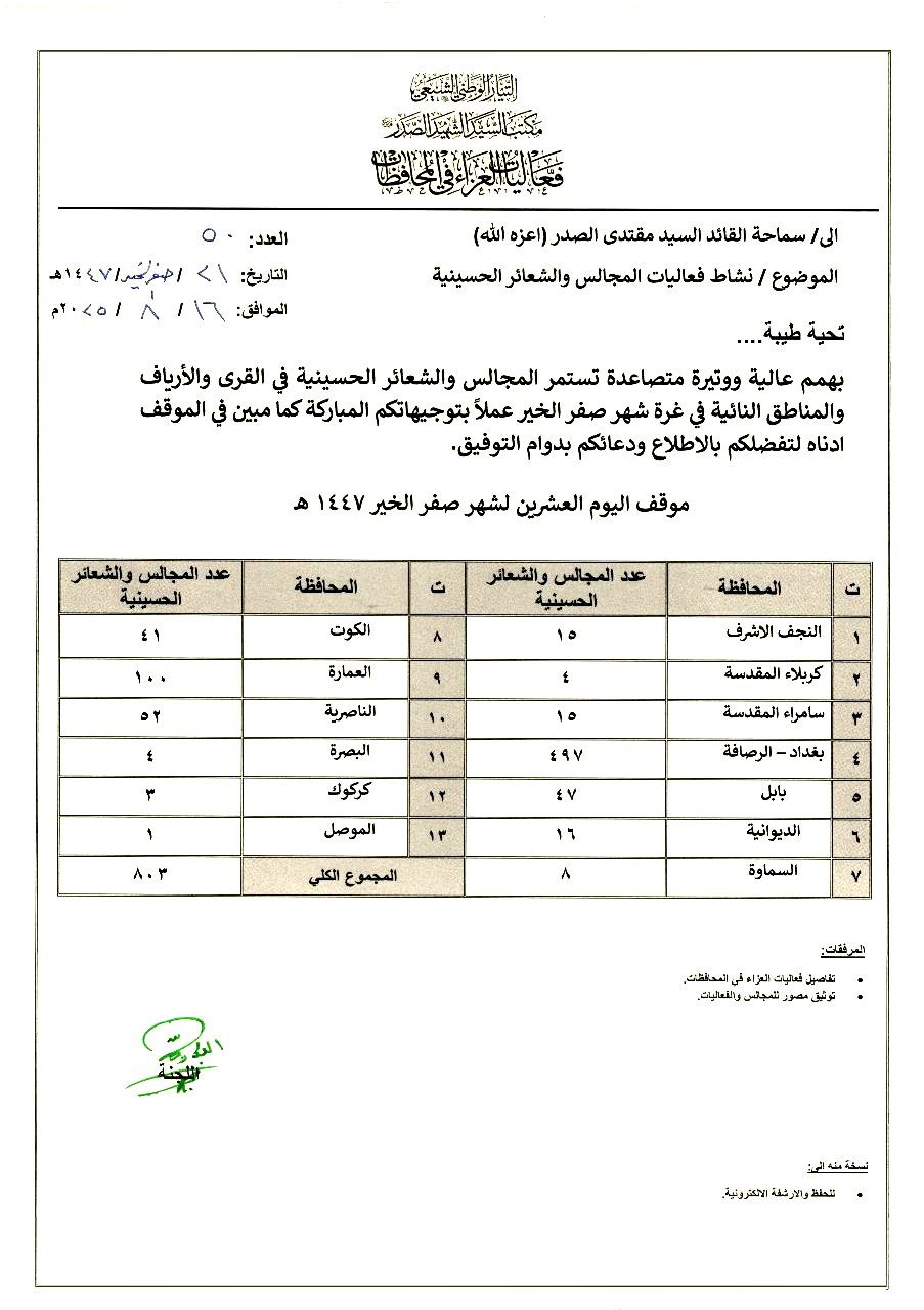 اطلع سماحة القائد السيد مقتدىٰ الصدر (أعزه الله) على أماكن وأعداد المجالس الحسينية المباركة المقامة في مدن العراق، حيث علّق سماحته (أعزه الله) بعبارة "رسول الله أولاً"