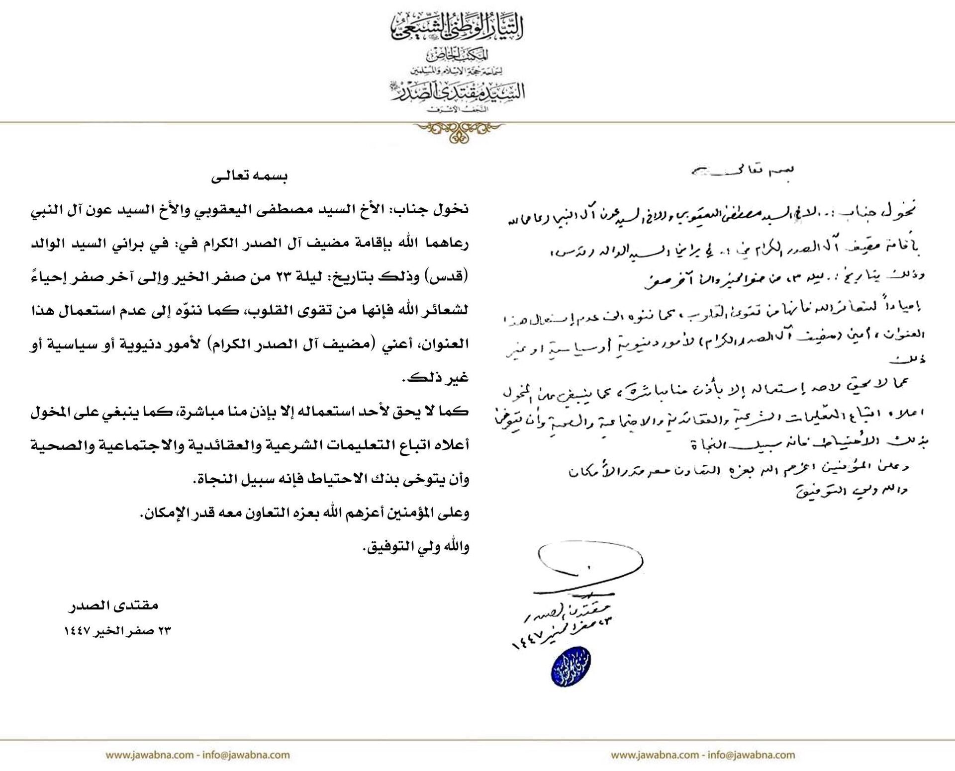 سماحة القائد السيد مقتدى الصدر (أعزه الله) يخول كلاً من جناب السيد مصطفى اليعقوبي وجناب السيد عون آل النبي (رعاهما الله) بإقامة مضيف آل الصدر الكرام في براني الشهيد السعيد السيد محمد الصدر (قدس سره)