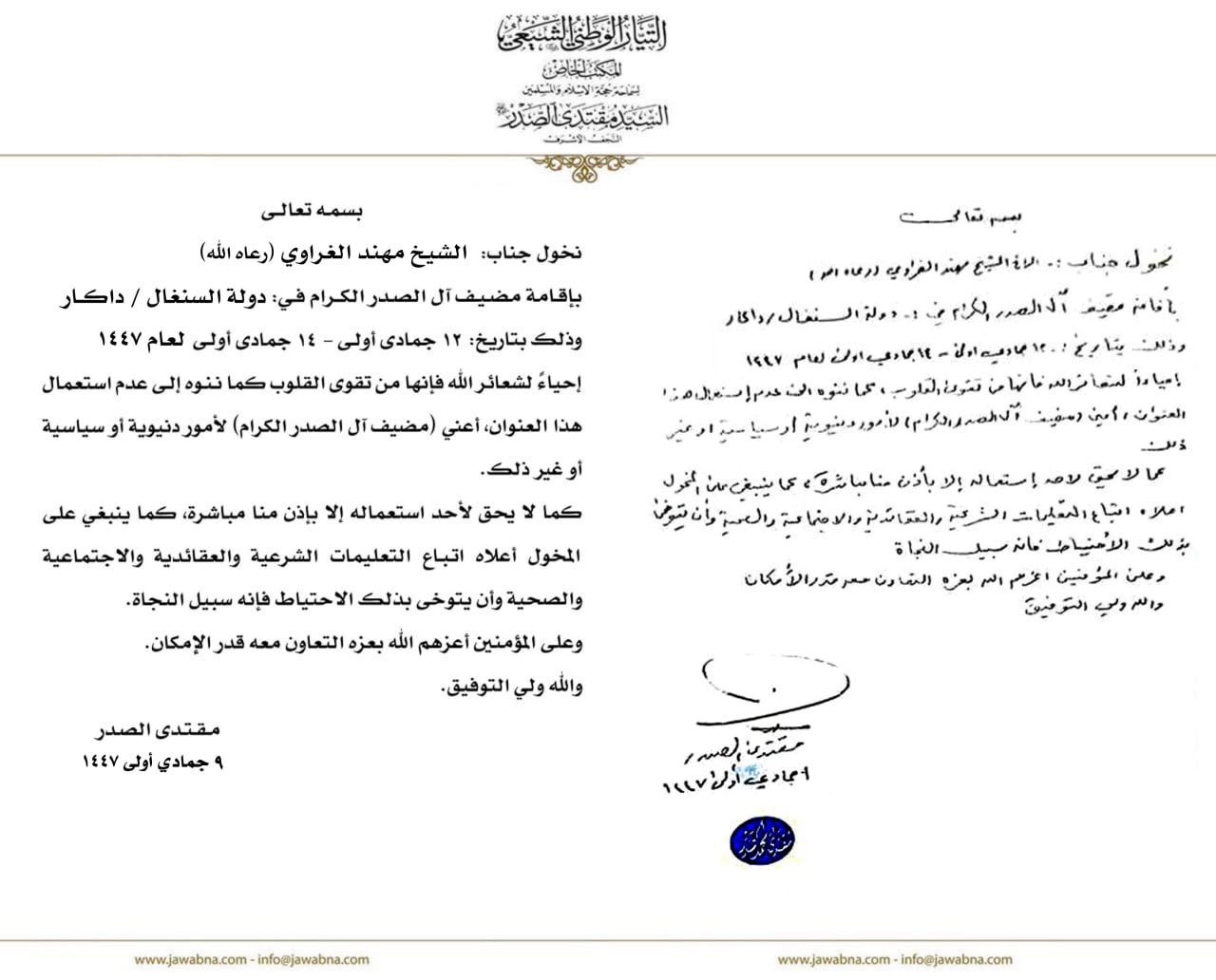 سماحة القائد السيد مقتدى الصدر (أعزه الله) يخول الشيخ مهند الغراوي (رعاه الله) لإقامة مضيف آل الصدر الكرام في دولة السنغال/داكار