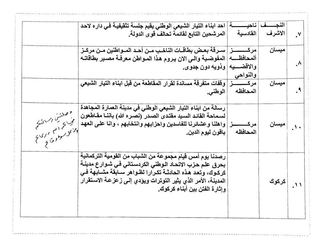 أما بخصوص رسالة من قبل أبناء التيار الشيعي الوطني في مدينة العمارة إلى سماحته بأنهم وأهاليهم وعشائرهم مقاطعون للفاسدين وانتخابهم أجاب سماحته (أعزه الله): "وصلتني رسالتكم فحياكم الله ورعاكم ومن كل سوء وقاكم".