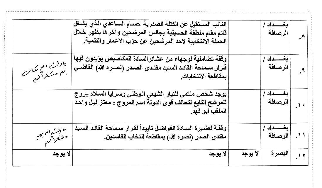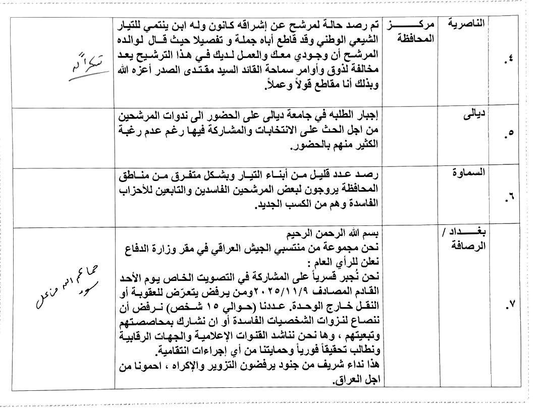 وحول إجبار مجموعة من منتسبي الجيش العراقي في مقر وزارة الدفاع قسرياً على المشاركة في التصويت الخاص، علق سماحته لهم بالقول: "حماكم الله من كل سوء". وفي تعليق سماحته حول وقفات احتجاجية تضامنية مع مشروع الإصلاح من قبل شباب من غير المنتمين إلى التيار الشيعي الوطني، وجّه سماحته بإيقاف الوقفات الاحتجاجية وحتى يوم الانتخابات حيث قال (رعاه الله): "من الآن فصاعداً.. أعني حتى يوم الانتخابات لا داعي لأي وقفات رجاءً".