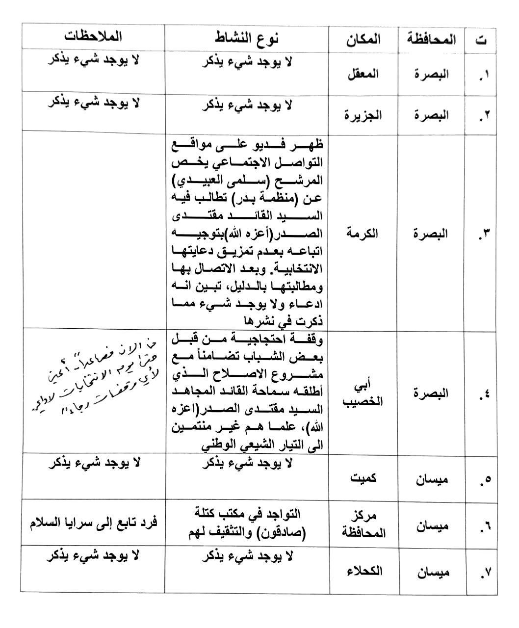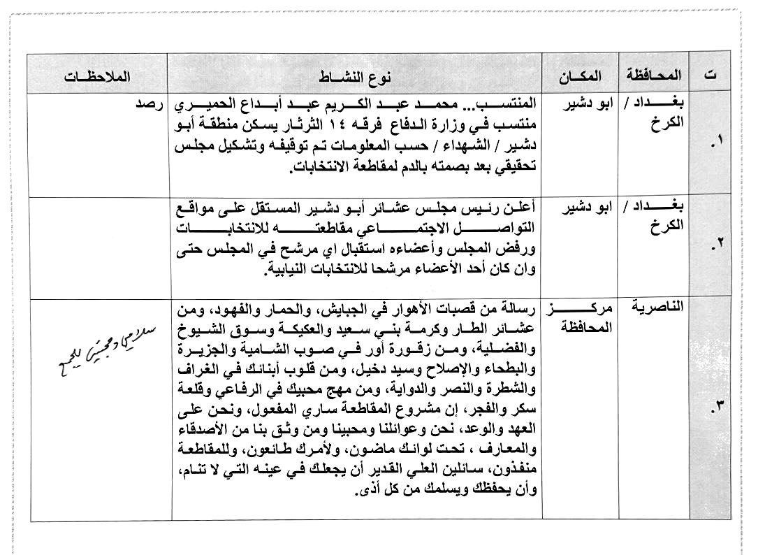 اطلع سماحة القائد السيد مقتدى الصدر (أعزه الله) على بعض النشاطات التي قدمت لسماحته حيث تضمنت وقفات عشائرية تضامنية يؤيدون فيها قرار سماحته في مقاطعة الانتخابات حيث علق سماحته بالقول: "بارك الله تعالى بهم وشكراً لهم" فيما بعث سماحته سلامه إلى أهالي معظم المدن والمناطق في محافظة الناصرية حيث قال سماحته: "سلامي ومحبتي للجميع".