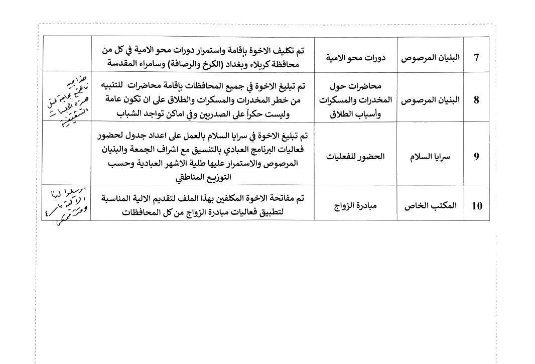 وفي مورد آخر، علق سماحته (أعزه الله) حول إقامة المحاضرات في أماكن تواجد الشباب للتنبيه من مخاطر المخدرات والمسكرات والطلاق بالقول: "هذا جيد فالمجتمع بحاجة لمثل هذه الجلسات التثقيفية"، أما فيما يخص ملف مبادرة الزواج في مختلف المحافظات العراقية وجّه سماحته بإرسال الآلية المناسبة لتطبيق هذه الفعالية معلقاً (أعزه الله): "أرسلوا لنا الآلية بأسرع وقت ممكن" فيما وجّه سماحته الشكر والتقدير حول النشاط اليومي الخاص بالبرنامج العبادي قائلاً (أعزه الله): "مع فائق الشكر والتقدير".