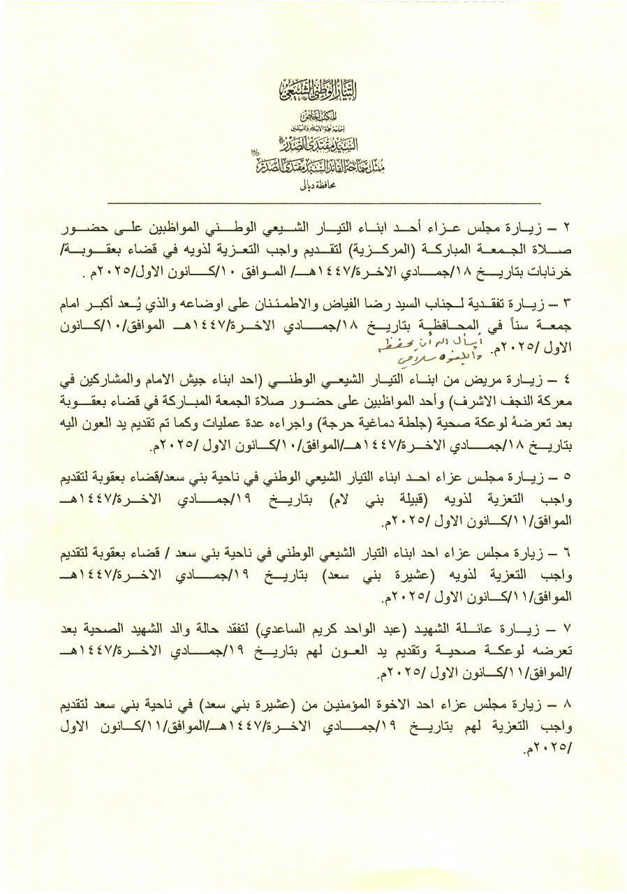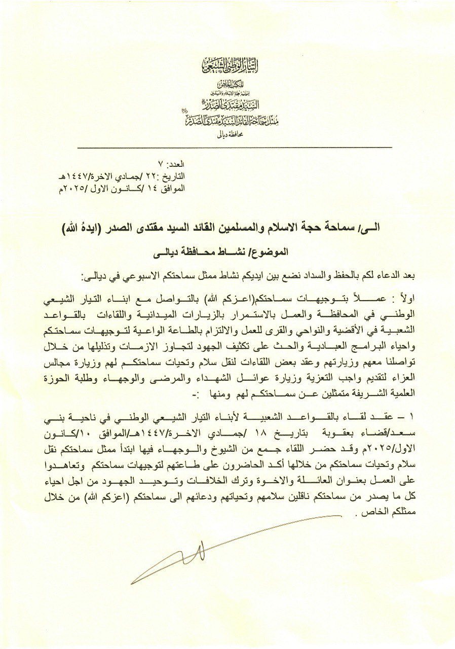 اطلع سماحة القائد السيد مقتدى الصدر (أعزه الله) على نشاطات ممثل سماحته في محافظة ديالى والتي تضمنت زيارات متعددة لأبناء التيار الشيعي الوطني في المحافظة وكذلك إحياء البرامج العبادية وزيارة مجالس العزاء وزيارة عوائل الشهداء والمرضى والوجهاء وطلبة الحوزة العلمية الشريفة حيث أكدوا على طاعتهم لتوجيهات سماحة القائد (أعزه الله) والعمل بعنوان العائلة والاخوة وترك الخلافات وتوحيد الجهود. ومن بين عدد من الزيارات التفقدية، تمت زيارة جناب السيد رضا الفياض (رعاه الله) للاطمئنان على أوضاعه ويعد أكبر إمام جمعة سناً في محافظة ديالى حيث علق سماحته (أعزه الله) بالقول: "أسـأل الله أن يحفـظـه وأبـلـغـوه سـلامـي".