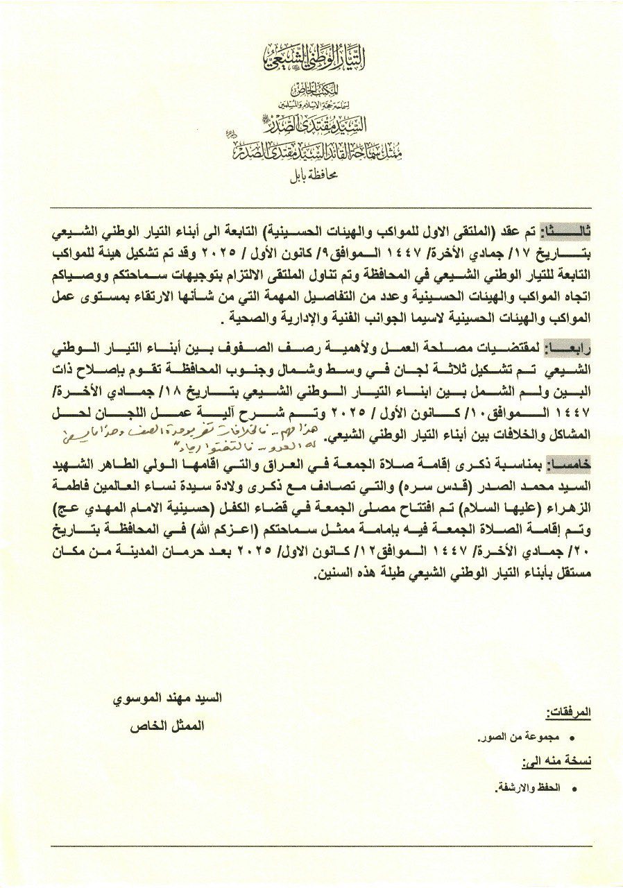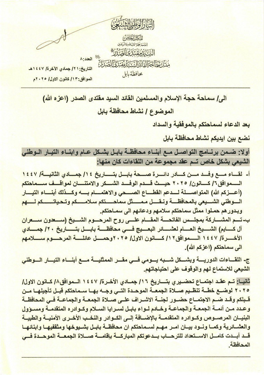 اطلع سماحة القائد السيد مقتدى الصدر (أعزه الله) على نشاطات ممثل سماحته في محافظة بابل حيث تضمنت النشاطات عدة فقرات من بينها التواصل مع أبناء المحافظة بشكل عام وأبناء التيار الشيعي الوطني بشكل خاص وتم عقد مجموعة من اللقاءات ومنها لقاء مع وفد من كادر دائرة صحة بابل حيث قدم الوفد الشكر والامتنان لمواقف سماحة القائد (أعزه الله) المتواصلة لدعم القطاع الصحي والاهتمام به، كما تم اللقاء مع أبناء التيار الشيعي الوطني للاستماع لهم والاطلاع على احتياجاتهم. كما تم عقد اجتماع تحضيري مع عدد من مفاصل التيار الشيعي الوطني لوضع خطة تنظيم صلاة الجمعة الموحدة التي وجّه بها سماحته قبل تأجيلها، بالإضافة إلى عقد الملتقى الأول للمواكب الحسينية وافتتاح مصلى الجمعة في قضاء الكفل. وبخصوص تشكيل ثلاث لجان في المحافظة مهمتها إصلاح ذات البين ولم الشمل وحل المشاكل والخلافات بين أبناء التيار الشيعي الوطني، علق سماحة القائد السيد مقتدى الصدر (أعزه الله) بالقول: "هذا مهم... فالخلافات تضر بوحدة الصف وهذا ما يسعى له العدو... فالتفتوا رجاءً".
