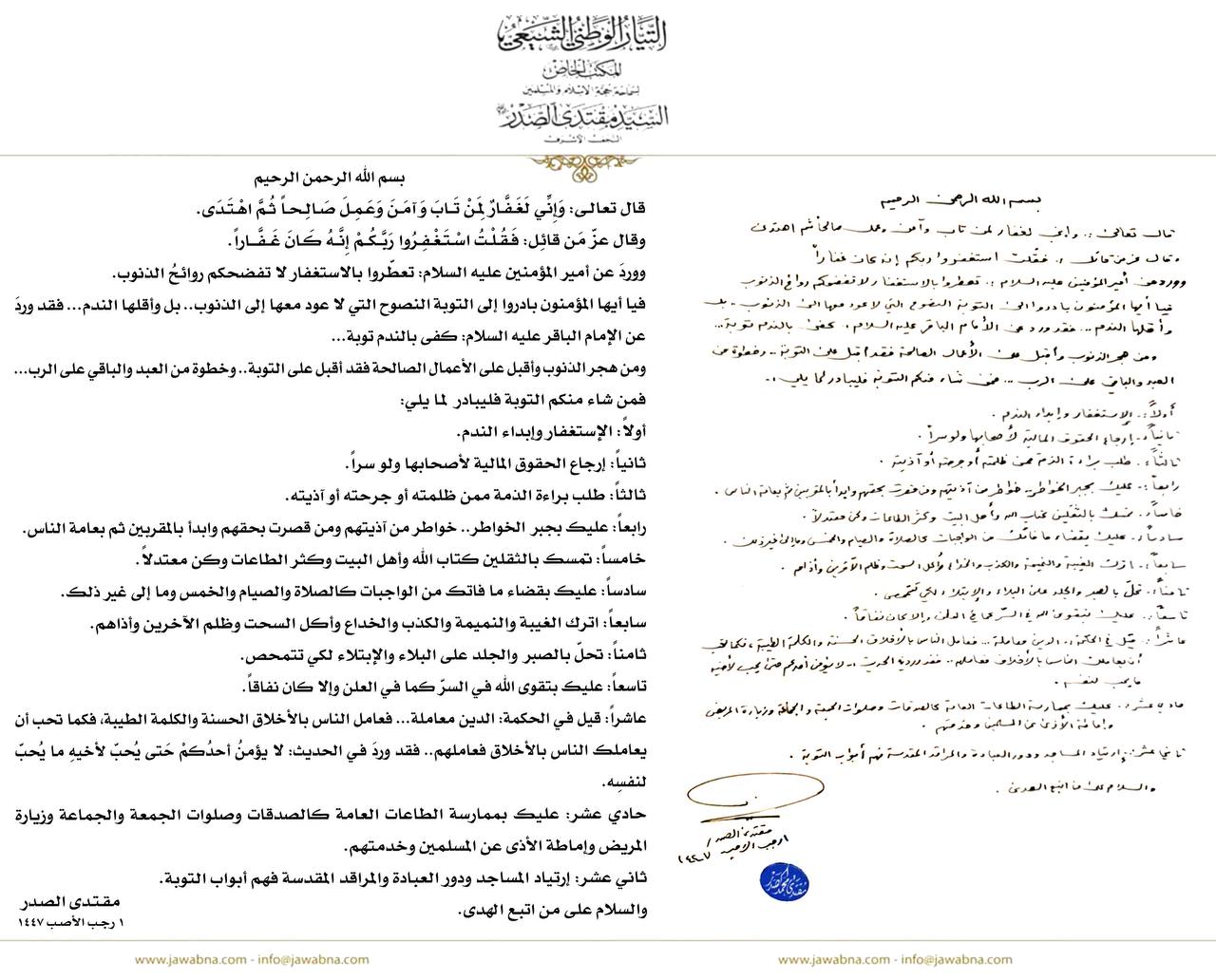 سماحة القائد السيد مقتدى الصدر (أعزه الله) يصدر بياناً مهماً من عدة نقاط حول التوبة النصوح 21/12/2025 17:44:00 عدد القراءات : 75 المكتب الخاص / النجف الأشرف