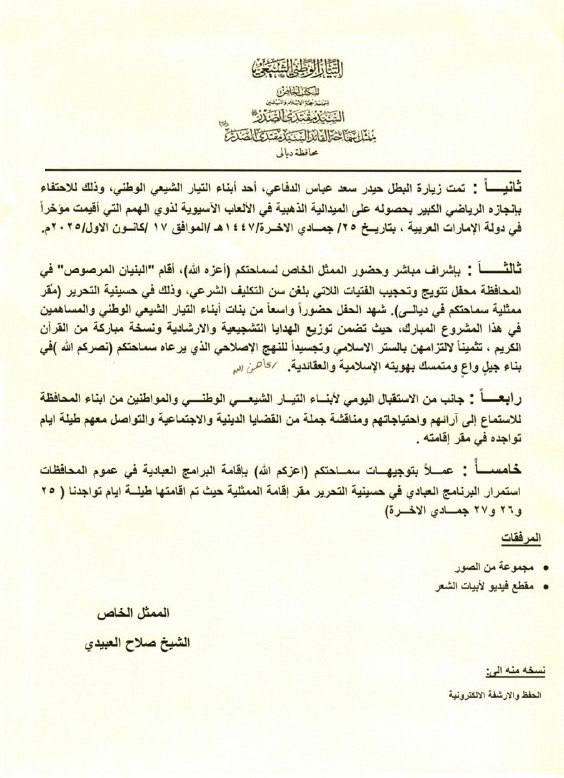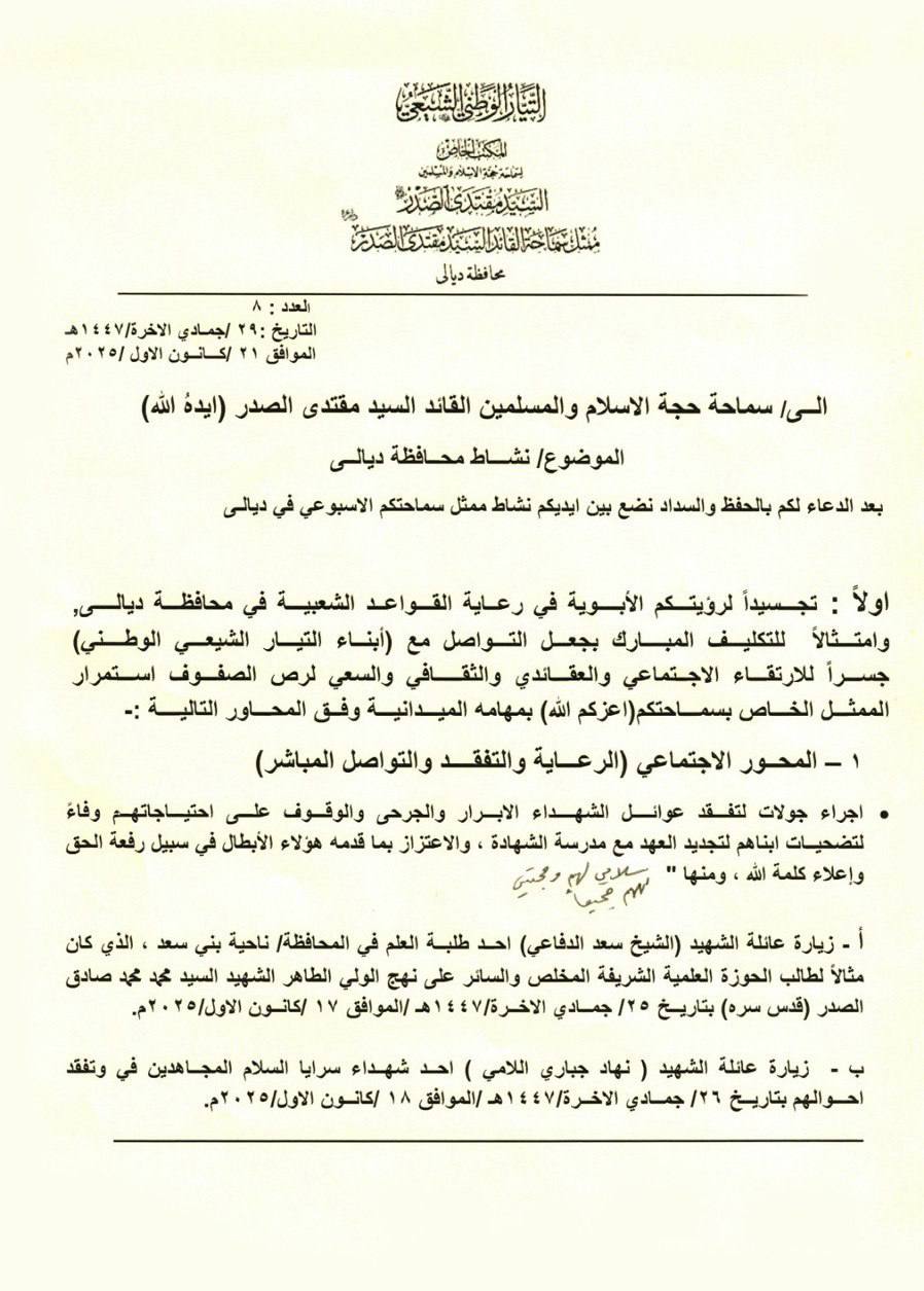 اطلع سماحة القائد السيد مقتدى الصدر (أعزه الله) على النشاط الأسبوعي لممثل سماحته في محافظة ديالى حيث تضمن المحور الاجتماعي من النشاطات الرعاية والتفقد والتواصل المباشر مع أبناء التيار الشيعي الوطني إذ تم إجراء جولات لتفقد عوائل الشهداء والجرحى والوقوف على احتياجاتهم، وعلق سماحته (أعزه الله) على هذه الفقرة بالقول: "سلامي لهم ومحبتي لهم جميعاً". كما تضمنت النشاطات أيضاً زيارة أحد أبناء التيار الشيعي الوطني للاحتفاء بإنجازه الرياضي وحصوله على الميدالية الذهبية في بطولة آسيوية لذوي الهمم.