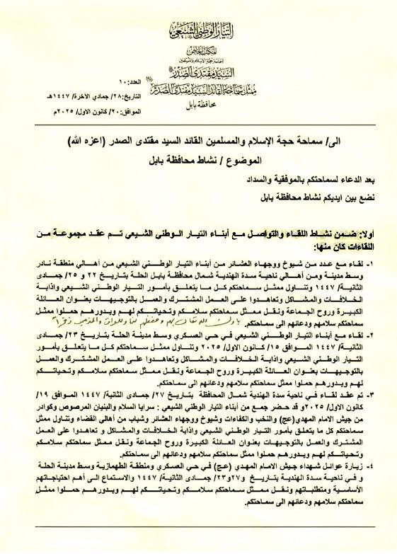اطلع سماحة القائد السيد مقتدى الصدر (أعزه الله) على نشاطات ممثل سماحته في محافظة بابل حيث تضمنت النشاطات اللقاء والتواصل مع أبناء التيار الشيعي الوطني ومنها عقد لقاء مع عدد من شيوخ ووجهاء العشائر من أبناء التيار الشيعي الوطني في منطقة نادر وسط المدينة وأهالي ناحية سدة الهندية وتناول ممثل سماحته كل ما يتعلق بأمور التيار الشيعي الوطني وإذابة الخلافات والمشاكل وتعاهدوا على العمل المشترك والعمل بالتوجيهات تحت عنوان العائلة الكبيرة وروح الجماعة، وكان تعليق سماحته (أعزه الله) على ذلك بالقول: "بـارك الله تعالى بهـم وحفظهـم لـنا وللعـراق والمذهـب ذخـراً".