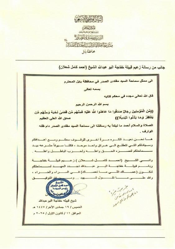 كما تم استلام رسالة من الشيخ أحمد كامل شعلان (رعاه الله)، زعيم قبيلة خفاجة ألبو عبد الله، موجهة إلى سماحة القائد السيد مقتدى الصدر (أعزه الله) يجدد فيها العهد لسماحته، فعلق (أعزه الله) بالقول: "جزيـت خـيـراً أسـأل الله تعالى أن يحمـيـكـم مـن كـل سـوء".