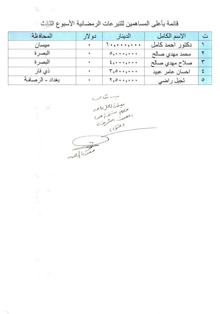 اطلع سماحة القائد السيد مقتدى الصدر (أعزه الله) على قائمة بأسماء أعلى المساهمين في التبرعات الرمضانية ضمن البرنامج العبادي وحسب توجيهات سماحته في وقت سابق. ووجّه سماحة القائد (أعزه الله) بتكريمهم بمنحهم هدية من المصحف الشريف مختوم بختم سماحته. جاء ذلك في تعليقه (أعزه الله) بالقول: "يعطى لكل واحد منهم نسخة من المصحف الشريف (مختوم) ".