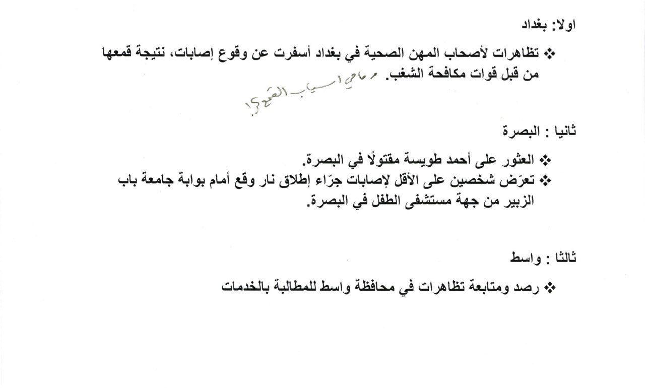 واطلع سماحته (أعزه الله) أيضا على بعض النشاطات التي قدمت لسماحته حيث تضمنت إحداها تظاهرات لأصحاب المهن الصحية في بغداد أسفرت عن وقوع إصابات نتيجة قمعها من قبل قوات مكافحة الشغب حيث تساءل سماحته عن سبب القمع. جاء ذلك في تعليقه (أعزه الله) بالقول "وما هي أسباب القمع؟! ".