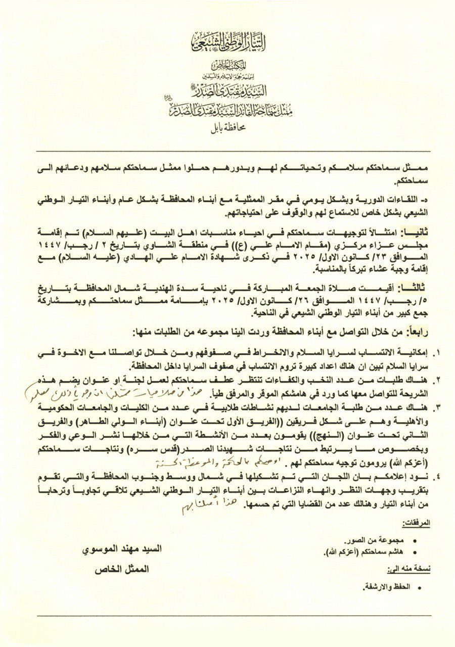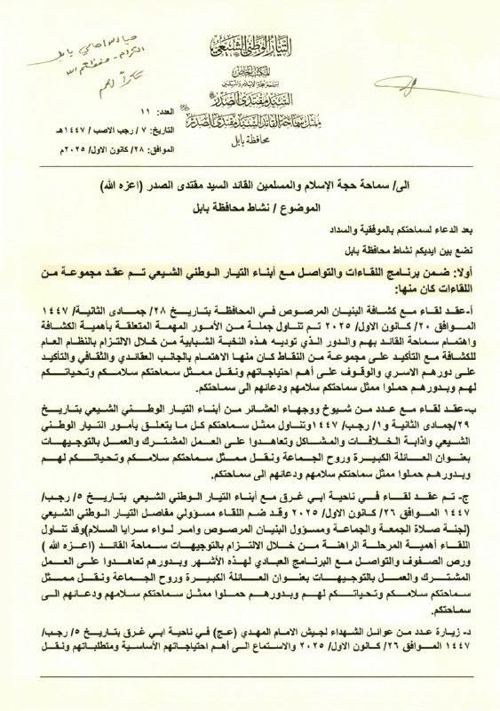 اطلع سماحة القائد السيد مقتدى الصدر (أعزه الله) على نشاطات ممثل سماحته في محافظة بابل والتي تضمنت عقد مجموعة من اللقاءات مع أبناء التيار الشيعي الوطني في عدة مناطق حيث علق سماحته (أعزه الله) على النشاطات بالقول: "حيا الله أهالي بابل الكرام.. حفظكم الله، شكراً لكم".