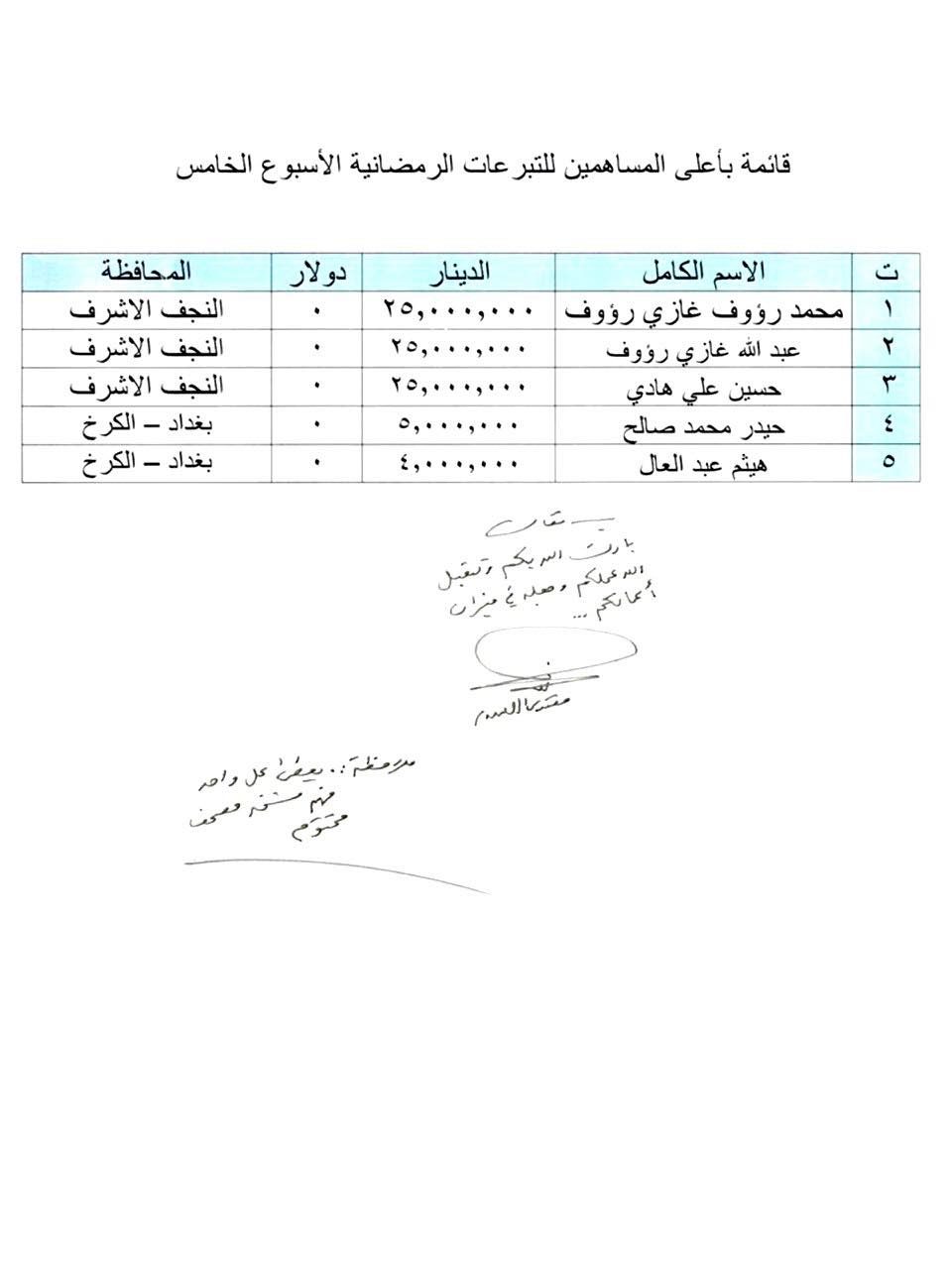 اطلع سماحة القائد السيد مقتدى الصدر (أعزه الله) على قائمة تضم أسماء أعلى المساهمين للتبرعات الرمضانية - الأسبوع الخامس. وجاء تعليق سماحته (أعزه الله) قائلاً: "بارك الله بكم وتقبل الله عملكم وجعله في ميزان أعمالكم..." مضيفاً سماحته بالقول: "ملاحظة: يعطى كل واحد منهم نسخة مصحف مختوم".