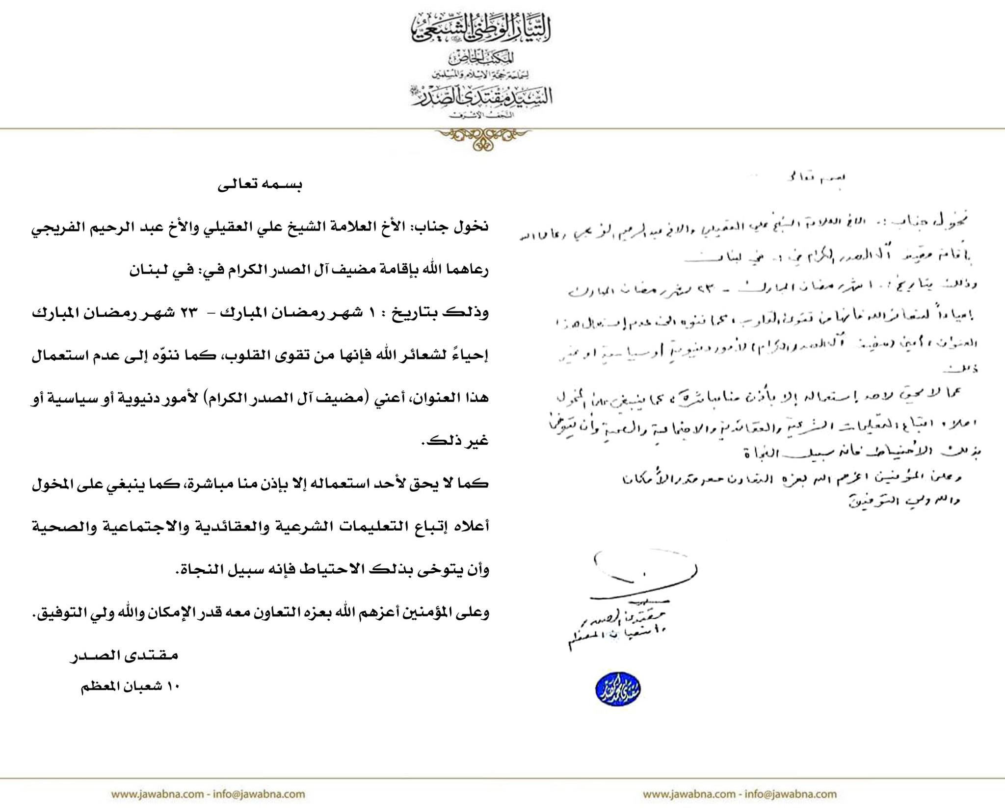 سماحة القائد السيد مقتدى الصدر (أعزه الله) يصدر تخويلاً بإقامة مضيف آل الصدر الكرام في دولة لبنان 30/01/2026 15:02:00 عدد القراءات : 160 المكتب الخاص / النجف الأشرف