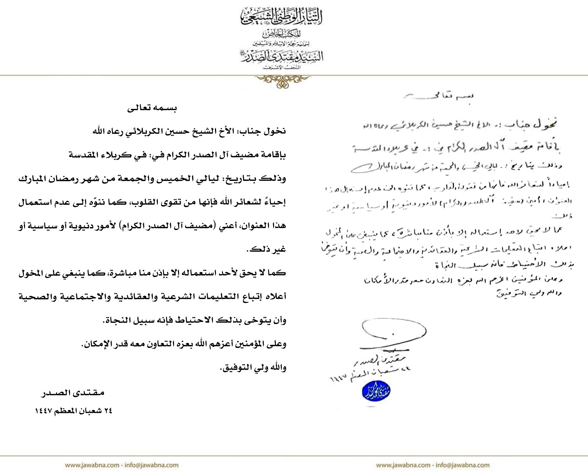 سماحة القائد السيد مقتدى الصدر (أعزه الله) يصدر تخويلاً بإقامة مضيف آل الصدر الكرام في كربلاء المقدسة 16/02/2026 17:11:00 عدد القراءات : 47 المكتب الخاص/ النجف الاشرف