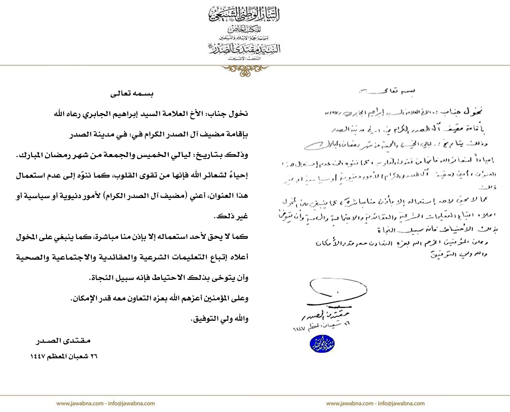 سماحة القائد السيد مقتدى الصدر (أعزه الله) يصدر تخويلاً بإقامة مضيف آل الصدر الكرام في مدينة الصدر 16/02/2026 17:14:00 عدد القراءات : 74 المكتب الخاص/ النجف الاشرف