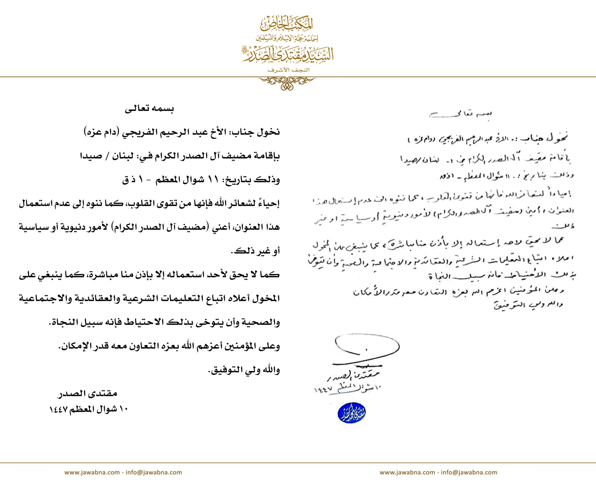 سماحة القائد السيد مقتدى الصدر (أعزه الله) يصدر تخويلاً لإقامة مضيف آل الصدر الكرام في لبنان - صيدا 30/03/2026 17:15:00 عدد القراءات : 124 المكتب الخاص / النجف الأشرف