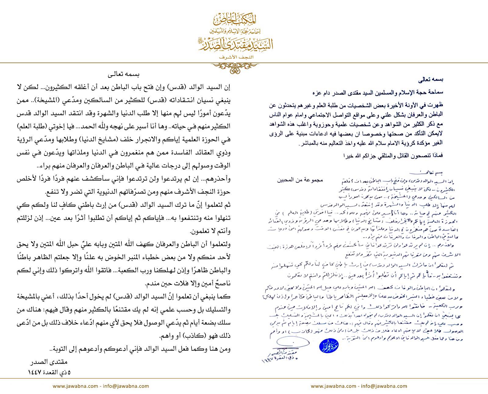 سماحة القائد السيد مقتدى الصدر (أعزه الله) يجيب على سؤال قدم لسماحته حول انتشار التحدث بالباطن والعرفان بشكل علني وعلى مواقع التواصل الاجتماعي