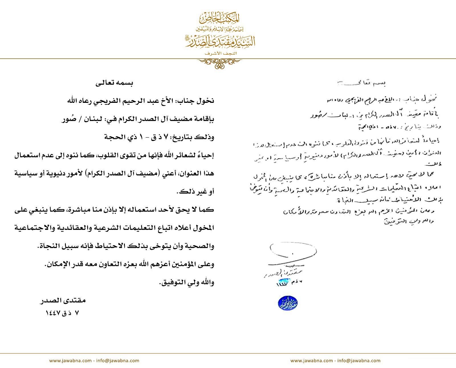 سماحة القائد السيد مقتدى الصدر (أعزه الله) يصدر تخويلاً لإقامة مضيف آل الصدر الكرام في لبنان - مدينة صور منذ 6 ساعة 59 دقيقة عدد القراءات : 28 المكتب الخاص / النجف الأشرف
