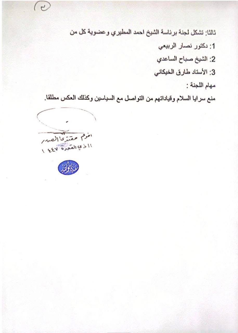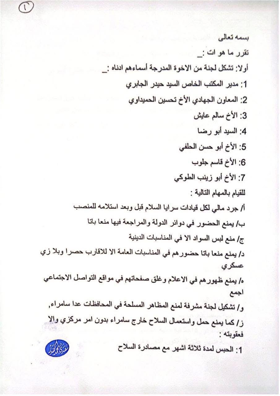 سماحة القائد السيد مقتدى الصدر (أعزه الله) يأمر بتشكيل عدد من اللجان يقع على عاتقها القيام باجراءات تخص افراد وقيادات سرايا السلام