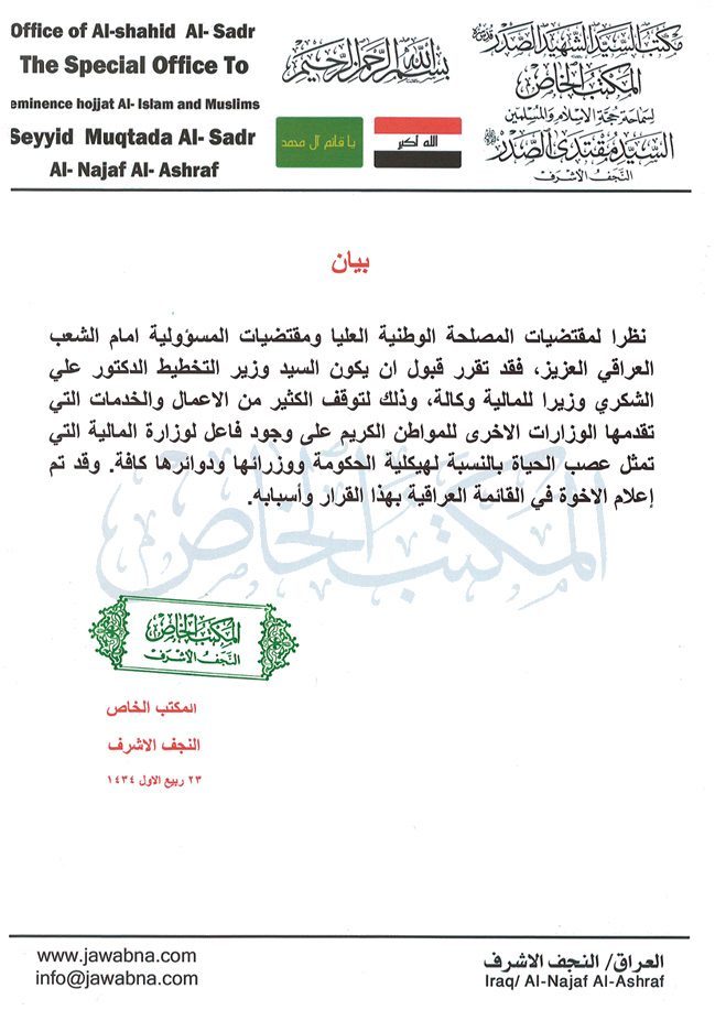 اصدر المكتب الخاص لسماحة حجة الاسلام والمسلمين السيد القائد مقتدى الصدر (أعزه الله) بيانا توضيحيا حول قرار الهيئة السياسية لمكتب السيد الشهيد الصدر قبول تسلم السيد وزير التخطيط الدكتور علي الشكري منصب وزير المالية بالوكالة.