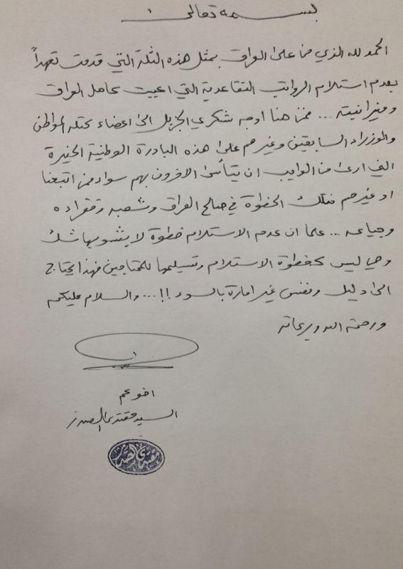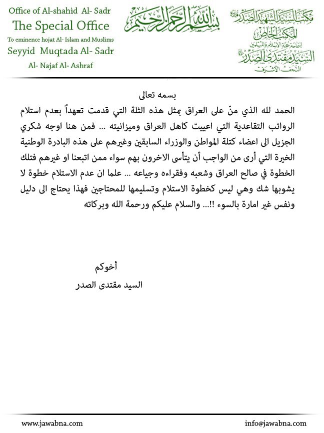 اصدر سماحة السيد القائد مقتدى الصدر (أعزه الله ) بيانا وجه فيه شكره الجزيل الى اعضاء كتلة المواطن والوزراء السابقين وغيرهم لعدم استلام الرواتب التقاعدية التي اعيت كاهل العراق وميزانيته وأضاف سماحته : أرى من الواجب أن يتأسى الاخرون بهم سواء ممن اتبعنا او غيرهم فتلك الخطوة في صالح العراق وشعبه وفقراءه وجياعه ...