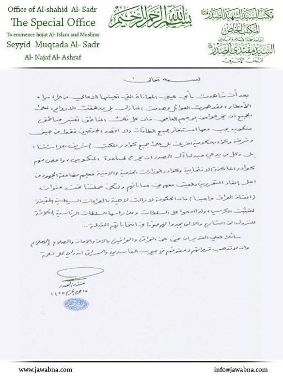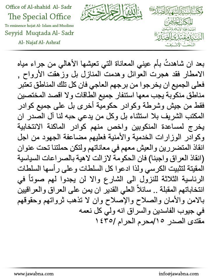 تفقد سماحة حجة الإسلام والمسلمين السيد القائد المجاهد مقتدى الصدر (أعزه الله ) ميدانيا محافظة النجف الاشرف التي تضررت جراء هطول الأمطار الغزيرة عليها حيث اطلع سماحته على معاناة المواطنين وعلى أثر ذلك أصدر سماحة السيد المجاهد بيانا أوضح فيه ما شاهده من معاناة التي عاشتها الأهالي من تهجير وهدم للمنازل وزهق للأرواح داعيا سماحته الجميع أن يخرجوا من برجهم العاجي واعتبار المناطق مناطقا منكوبة وأكد سماحته أن لا يكون الاستنفار مقتصرا على الجيش والشرطة بل على جميع كوادر المكتب الشريف بلا استثناء بل وكل من يدعي حبه لآل الصدر الكرام أن يخرج لمساعدة المنكوبين وخص منهم كوادر الماكنة الانتخابية وكوادر الوزارات الخدمية والأمنية وشدد سماحته على مضاعفة الجهود من اجل انقاذ المتضررين والعيش معهم في معاناتهم واضاف سماحته لتكن حملتنا تحت عنوان (انقاذ العراق واجبنا) فان الحكومة لازالت لاهية بالصراعات السياسية المقيتة لتثبيت الكرسي داعيا كل السلطات وعلى رأسها السلطات الرئاسية الثلاثة للنزول الى الشارع والا لن يجدوا لهم صوتاً في انتخاباتهم المقبلة