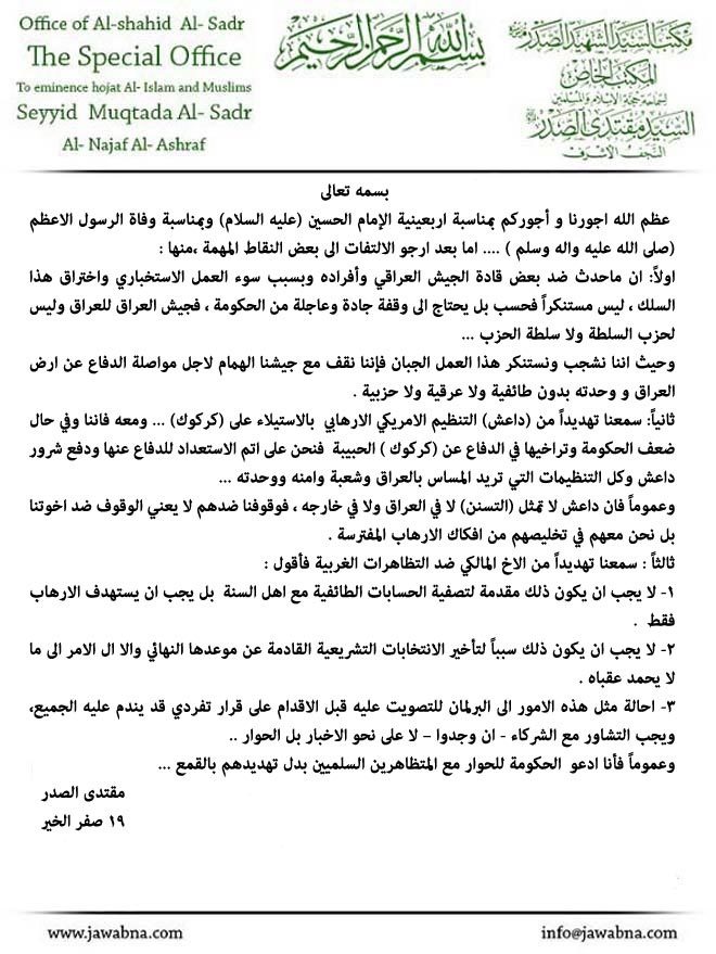 اصدر سماحة حجة الاسلام والمسلمين السيد القائد مقتدى الصدر (أعزه الله) بيانا بخصوص حادثة اغتيال مجموعة من القادة العسكريين من الجيش العراقي في محافظة الانبار وما رافقها من تهديد رئيس الحكومة بشن عملية عسكرية في المحافظة لتطهيرها من الجماعات الارهابية . وفيما يلي نص البيان