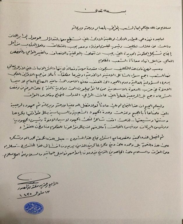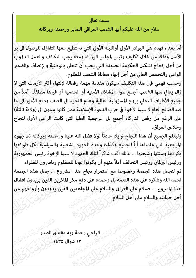 أصدر سماحة حجة الإسلام والمسلمين السيد القائد مقتدى الصدر(أعزه الله) بيانا حول تكليف مرشح التحالف الوطني لرئاسة مجلس الوزراء من أجل تشكيل الحكومة العراقية الجديدة قال فيه: فهذه هي البوادر الأولى أو اللبنة الأولى التي نستطيع معها التفاؤل للوصول الى بر الأمان وذلك من خلال تكليف رئيس لمجلس الوزراء ومعه يجب التكاتف والعمل الدؤوب من أجل انجاح تشكيل الحكومة الجديدة التي يجب أن تتحلى بالوطنية والإنصاف والضمير الواعي وأضاف سماحته إن هذا التكليف سيكون مقدمة مهمة وفعالة لإنهاء أكثر الأزمات التي لا زال يعاني منها الشعب أجمع سواء المشاكل الأمنية أو الخدمية أو غيرها وأكد سماحته أن هذا النجاح لم يك حادثاً لو فضل الله علينا ورحمته وبركاته ثم جهود المرجعية التي علمناها أباً للجميع وكذلك وحدة الجهود الشعبية والسياسية بكل طوائفها بكردها وسنتها وشيعتها، داعيا سماحته لجعل يوم الجمعة القادم جمعة لحمد الله وشكره على هذه النعمة بل وحمده على دفع مكر الماكرين....