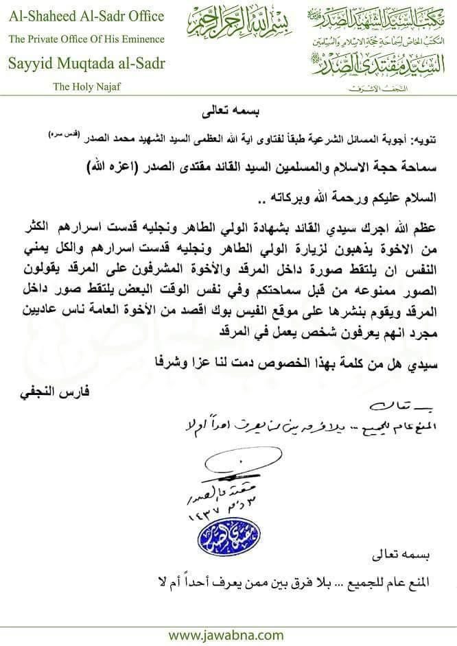 سماحة السيد القائد مقتدى الصدر(اعزه الله) يؤكد على منع التقاط الصور في داخل مرقد السيد الشهيد محمد الصدر(رضوان الله تعالى عليه) دون استثناء