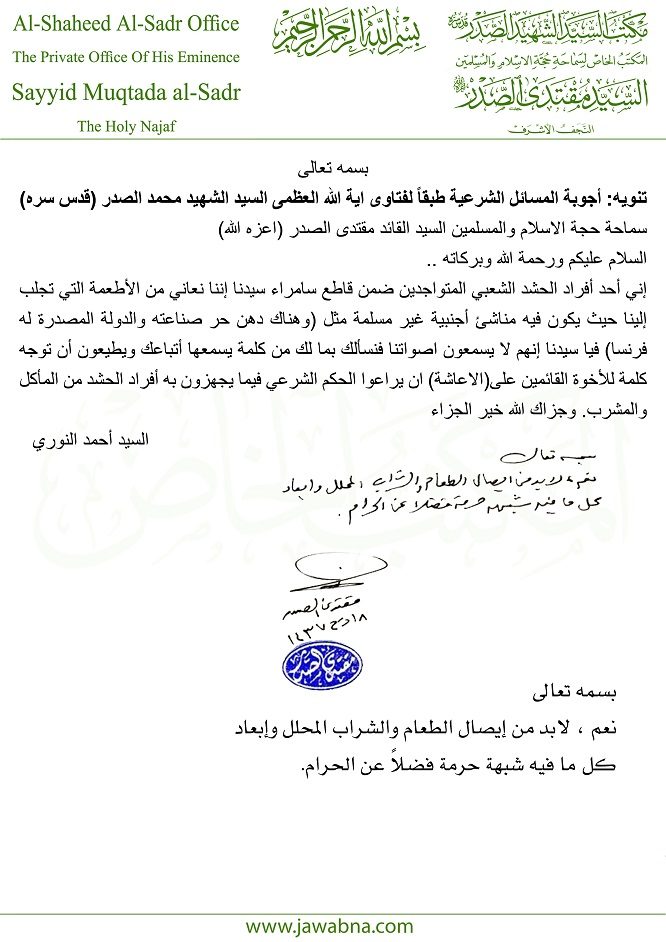 سماحة السيد القائد مقتدى الصدر(أعزه الله) يجيب على سؤال حول أهمية ايصال الطعام والشراب المحلل للحشد الشعبي وابعاد كل مافيه شبهة وحرمة